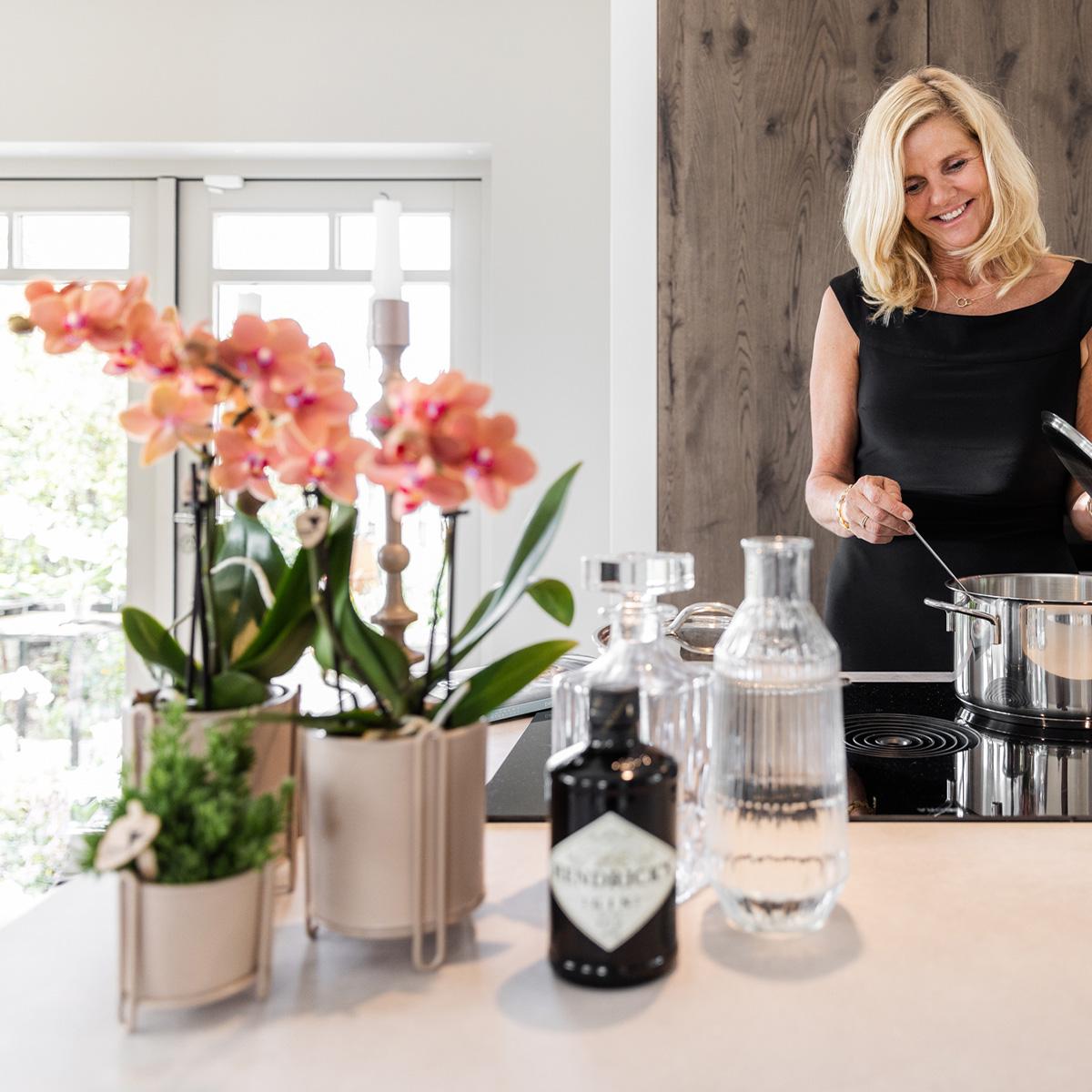 Geef jouw orchidee één keer per week water door de kweekpot onder te dompelen in het water. Laat de orchidee hierna goed uitlekken voordat je de kamerplant terug in de sierpot zet. Kies een lichte plek uit, maar niet in direct zonlicht, met kamertemperaturen tussen 18 en 21 graden. Zet de orchidee daarnaast niet in de buurt van een kachel of verwarming.