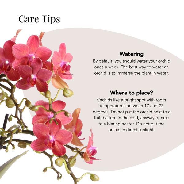 Plaats deze rode Phalaenopsis orchidee op een lichte plek met voldoende daglicht, maar uit direct zonlicht. De ideale temperatuur ligt tussen 17 en 22°C. Vermijd een plek dicht bij een verwarming of naast een fruitschaal – dit kan de bloei negatief beïnvloeden.